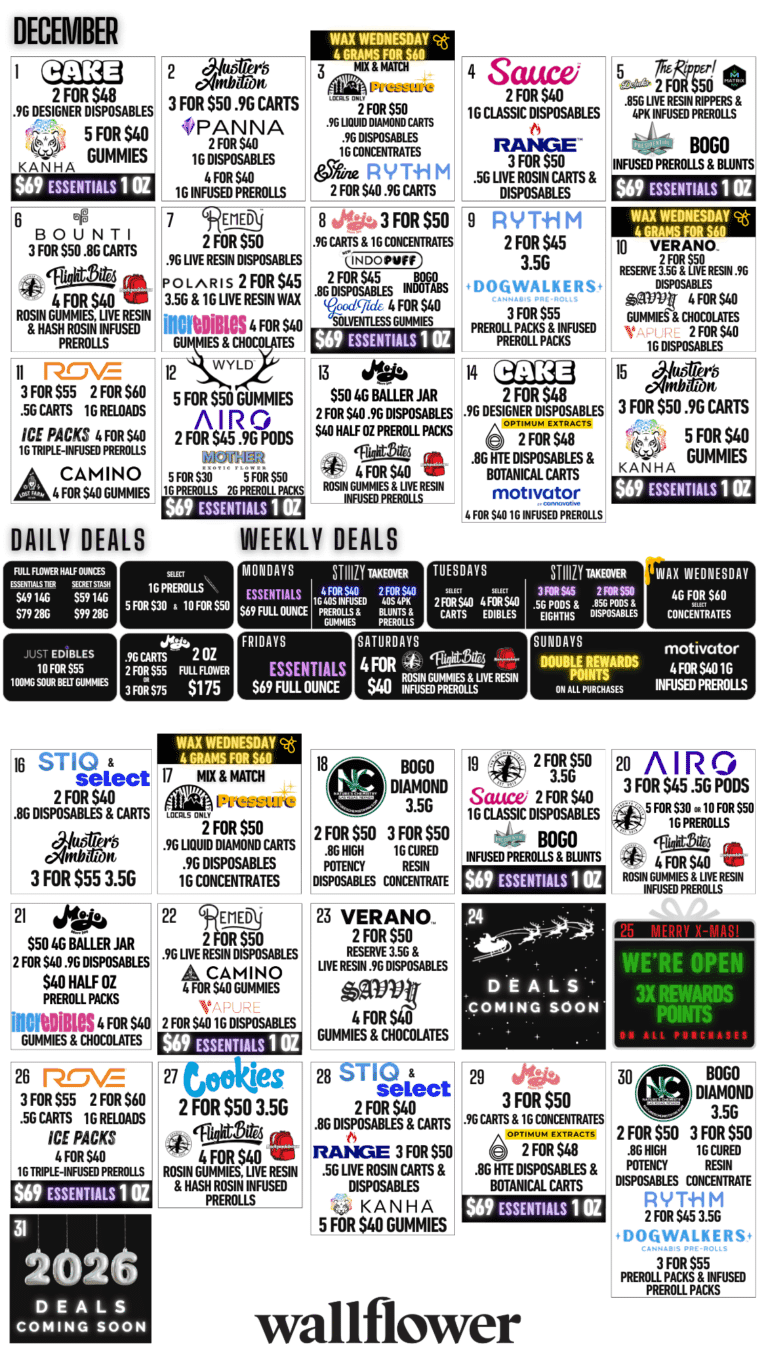 Disclaimer: All items are while supplies last. All promotions subject to change. Select strains/flavors may apply. Promotions start and end at 7am daily. Keep out of reach of children.